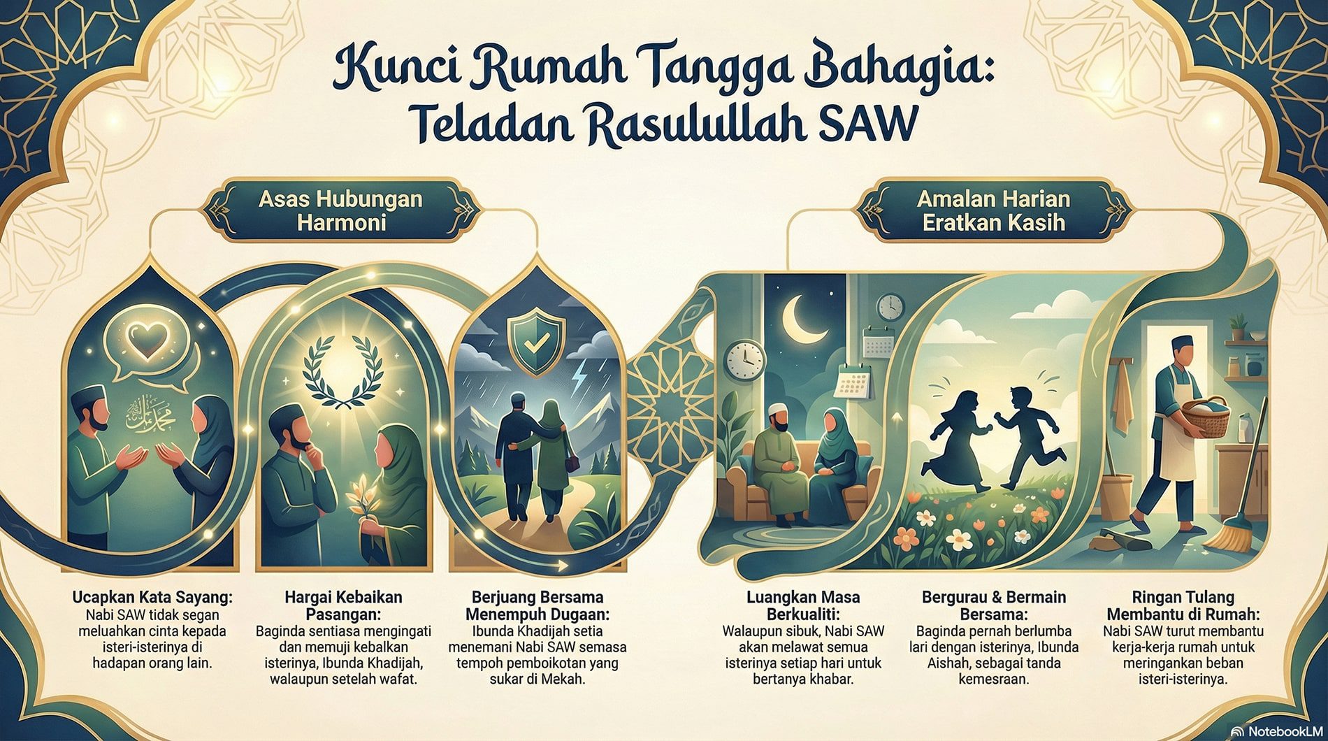 Ketahui bagaimana Rasulullah SAW menzahirkan kasih sayang melalui panggilan manja, amalan mandi bersama, berlumba lari, malah mengusap air mata isteri ketika sedih. - Inspirasi daripada 12 Ummahāt al-Mu’minīn